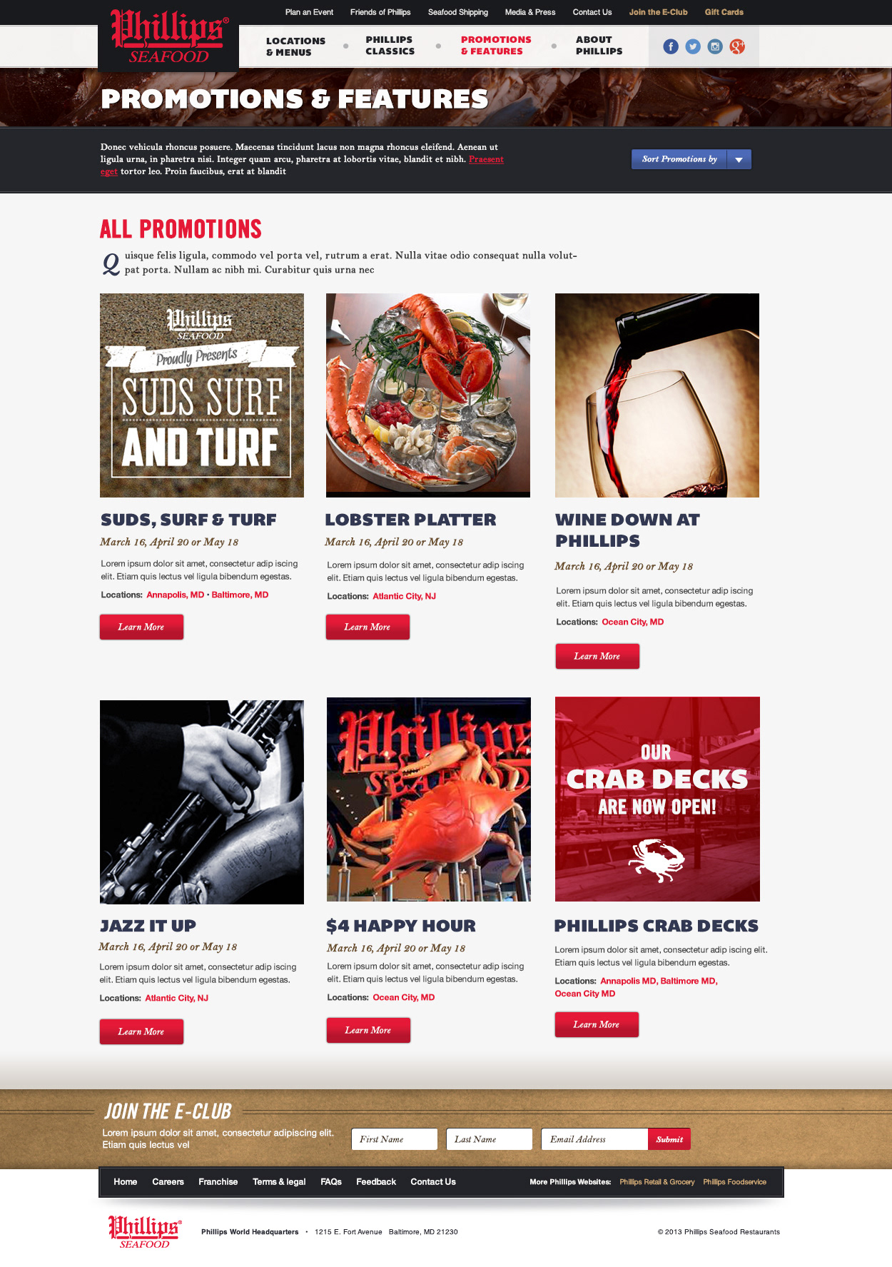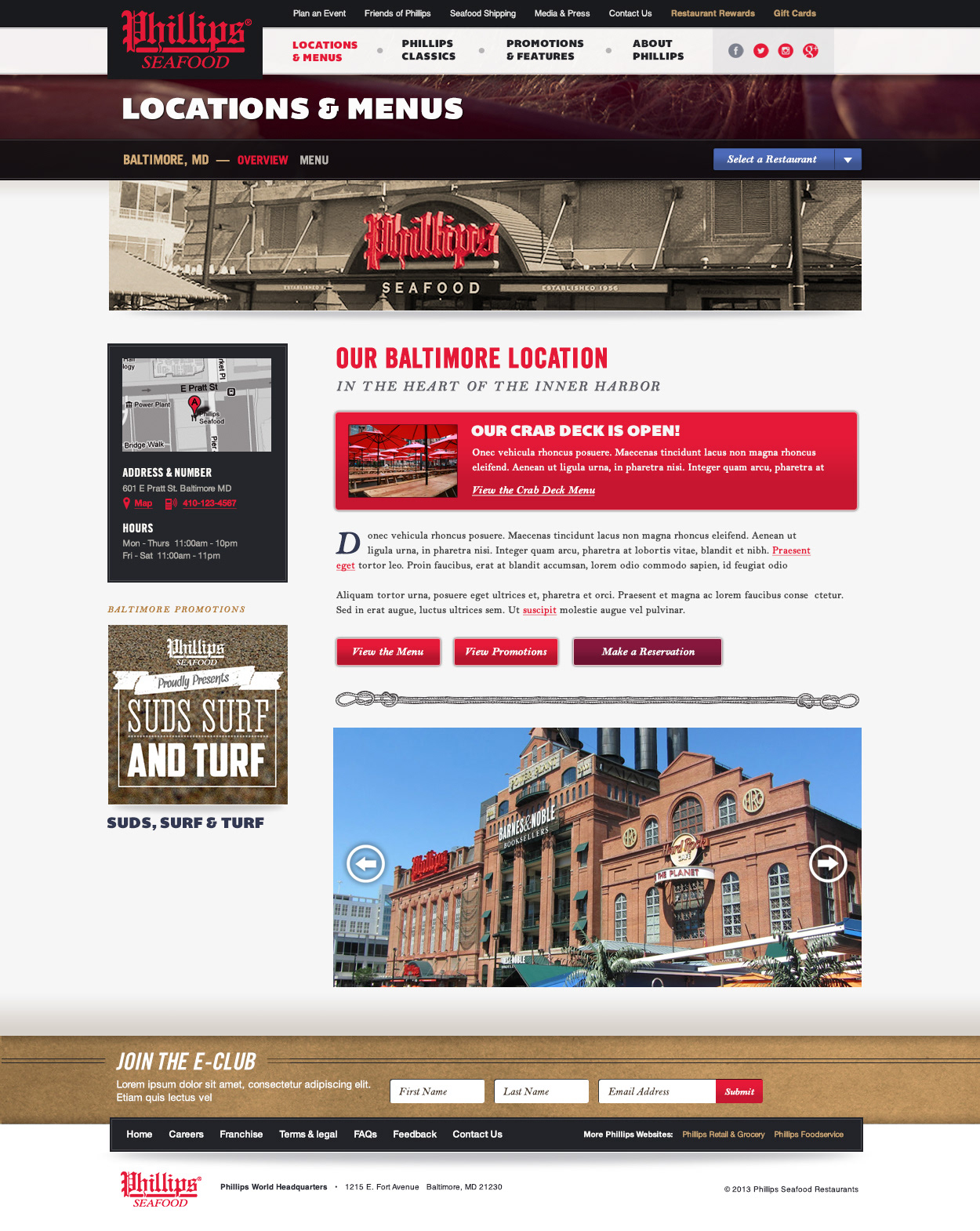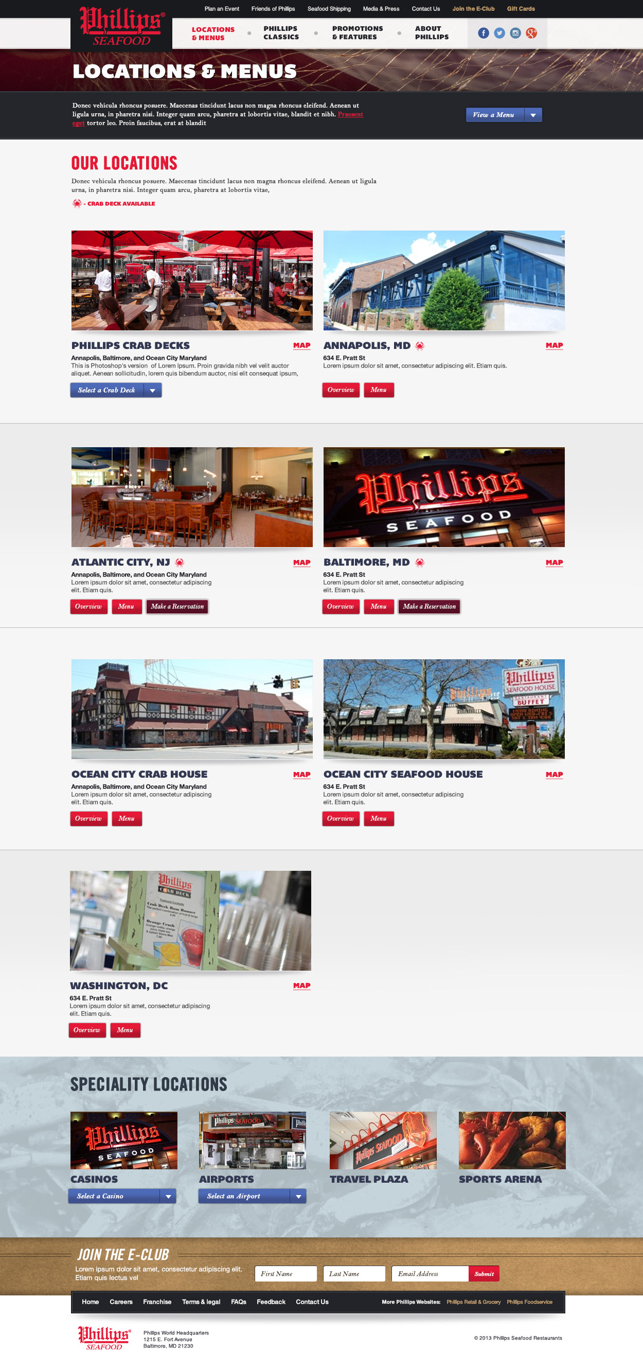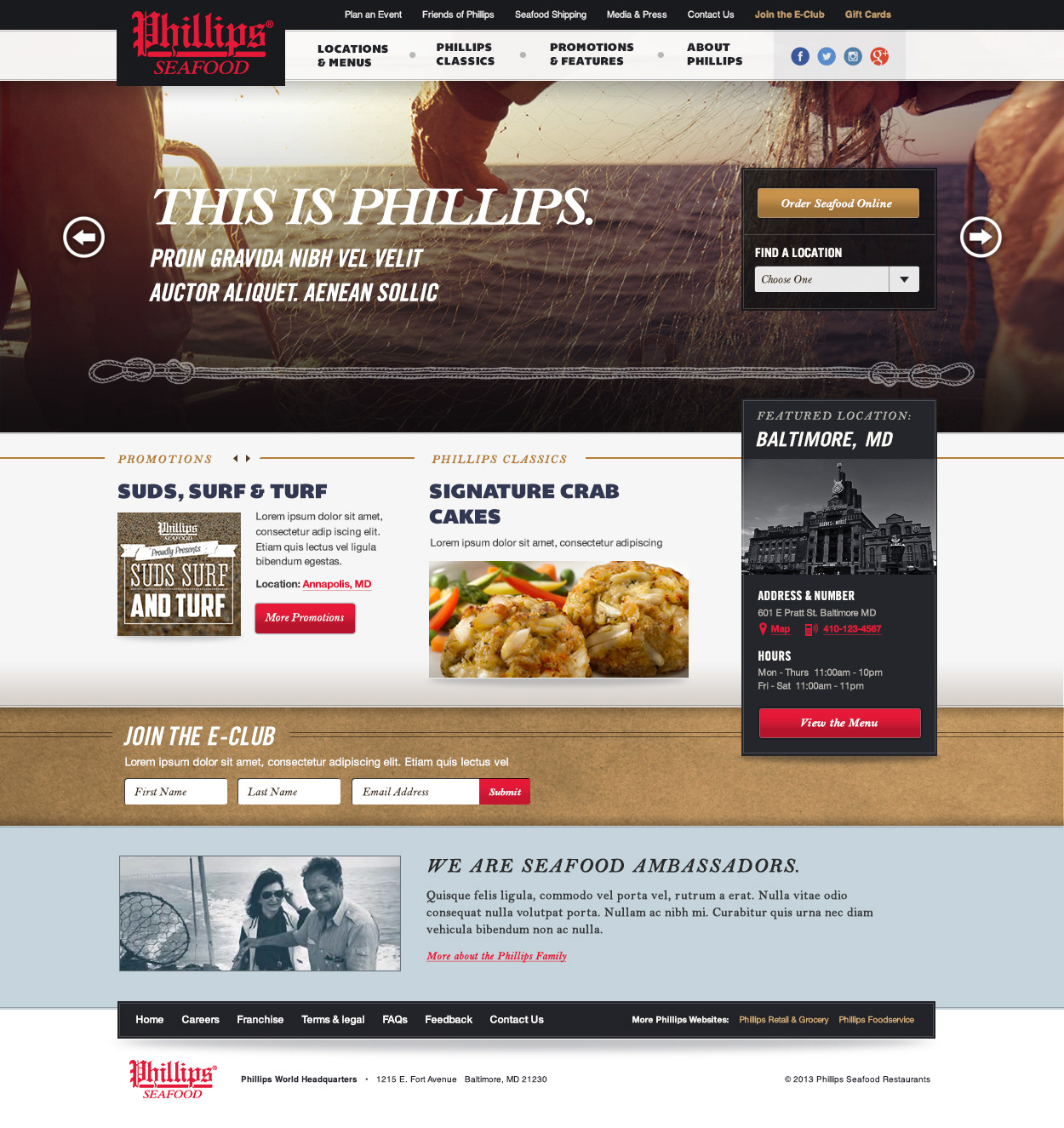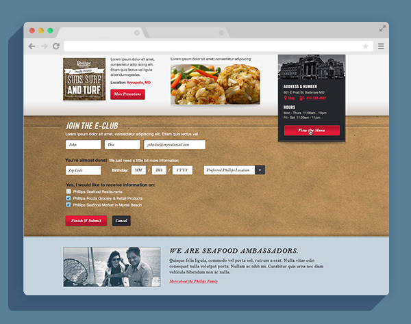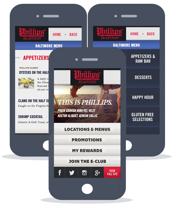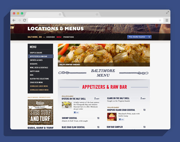 Complete overhaul design for Phillips Seafood Restaurant site. Introduced nautical design assets to celebrate the company's 100 year heritage and brought their locations and menus the the forefront. A separate mobile site was also designed.