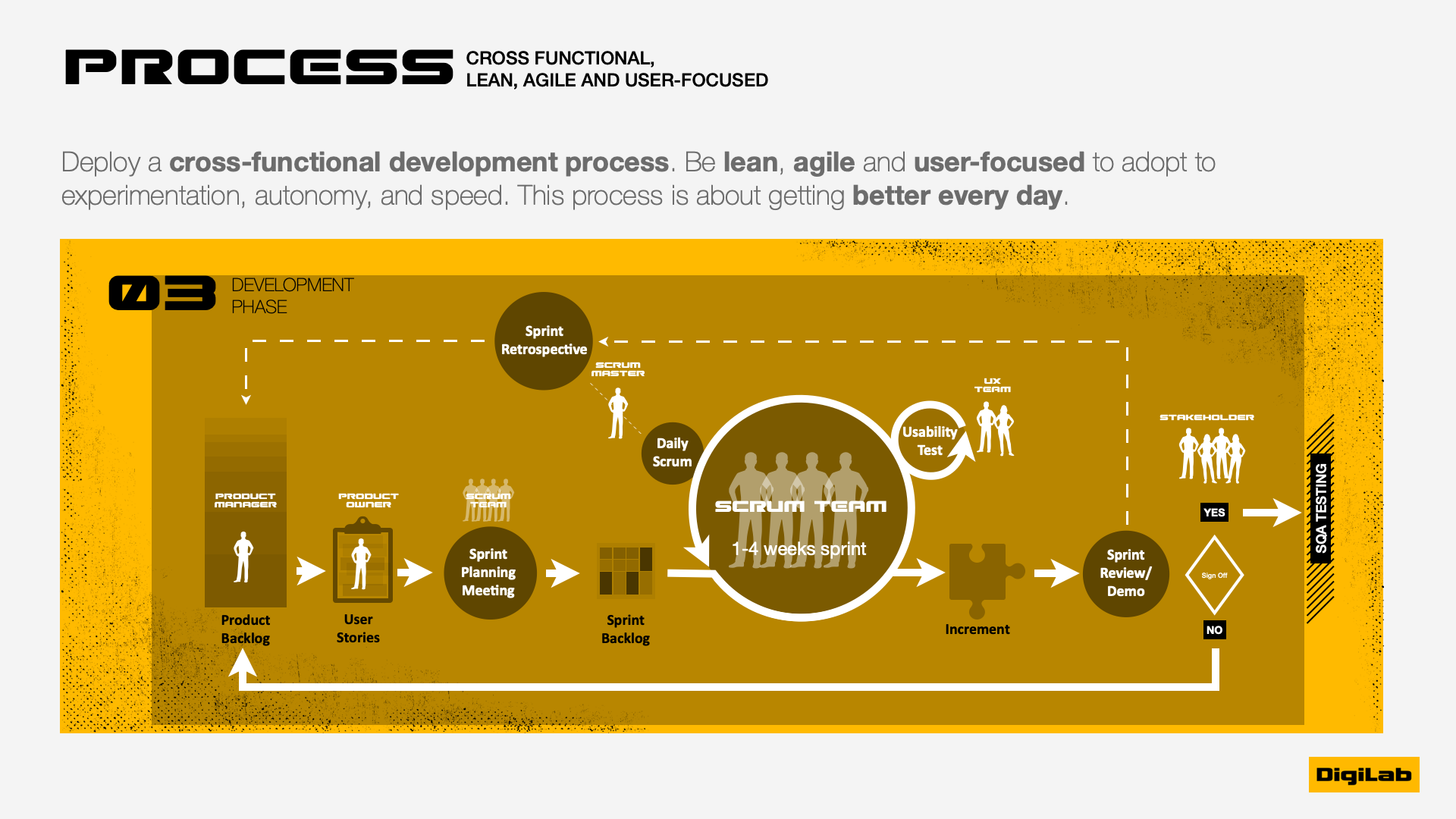Process diagram showing my sprint cycle. I typically work closely with product owners to define user goals based on research, write user stories, wireframe and prototype and then work with the development team on fulfilling user needs in bi-weekly sprints.